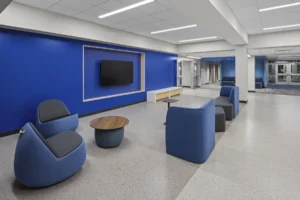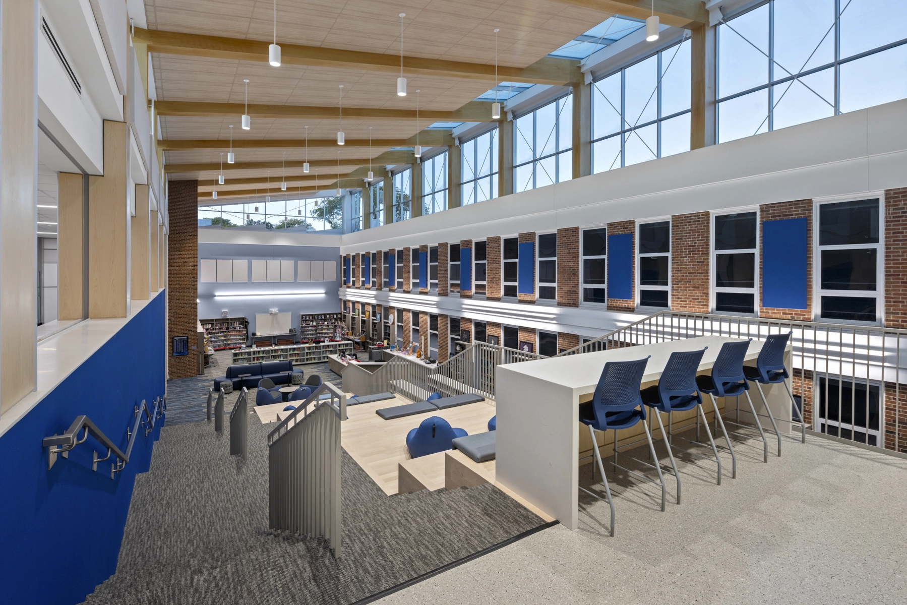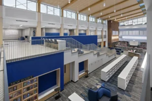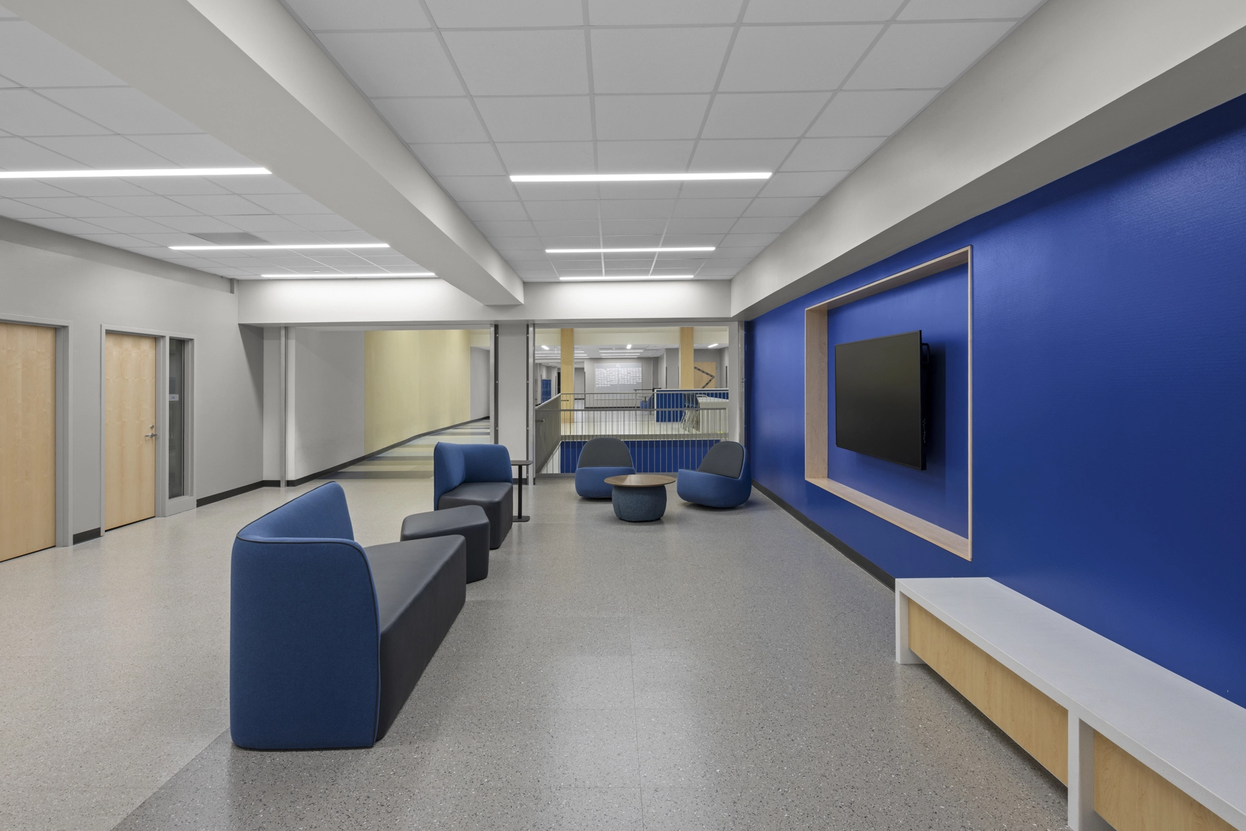Middle school addition and renovation featuring updated classrooms and newly constructed collaboration spaces. The modern design incorporated a range of architectural finishes for a refreshed and contemporary atmosphere.