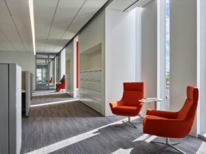 Architectural cabinets & woodwork, wood wall bases and solid surface countertops and solid surface wall paneling throughout the common corridors, featuring an oval shaped elevator lobby cladded with solid surface paneling on both the first and second floors.