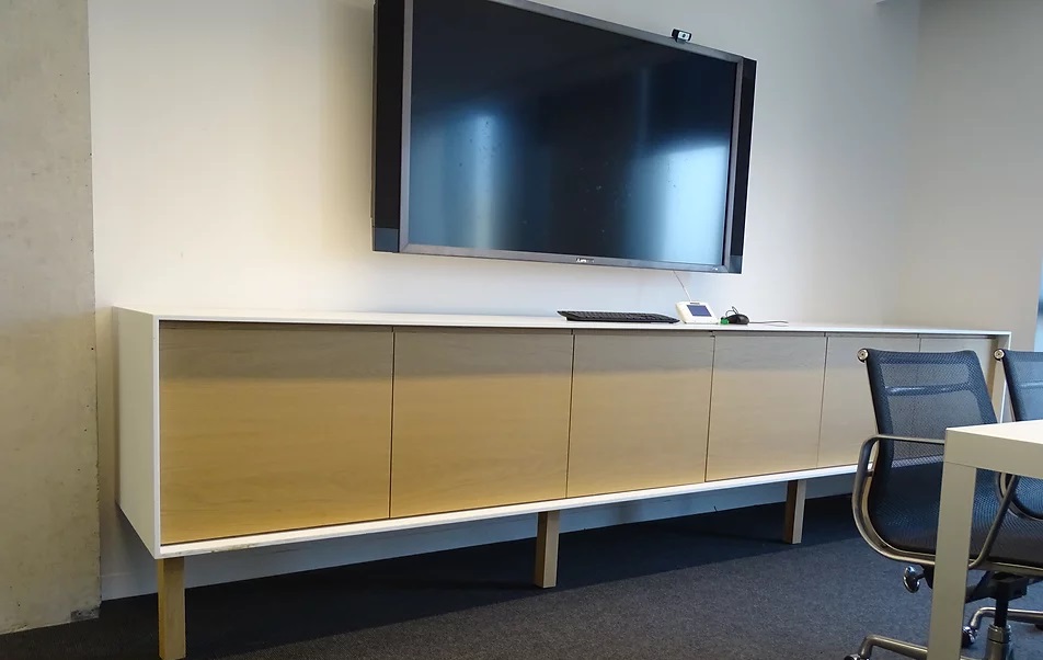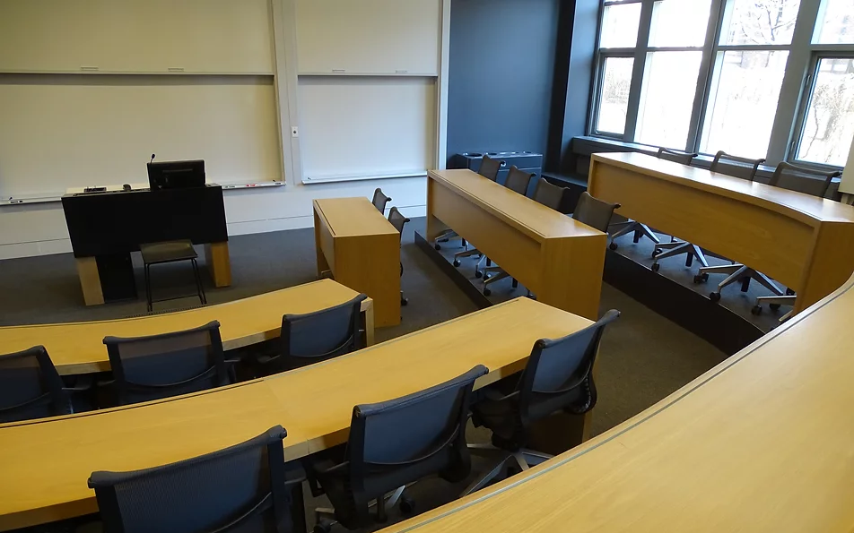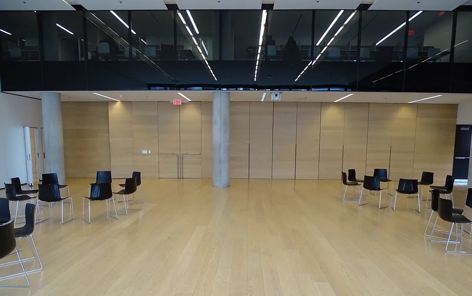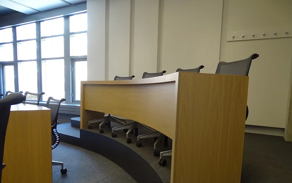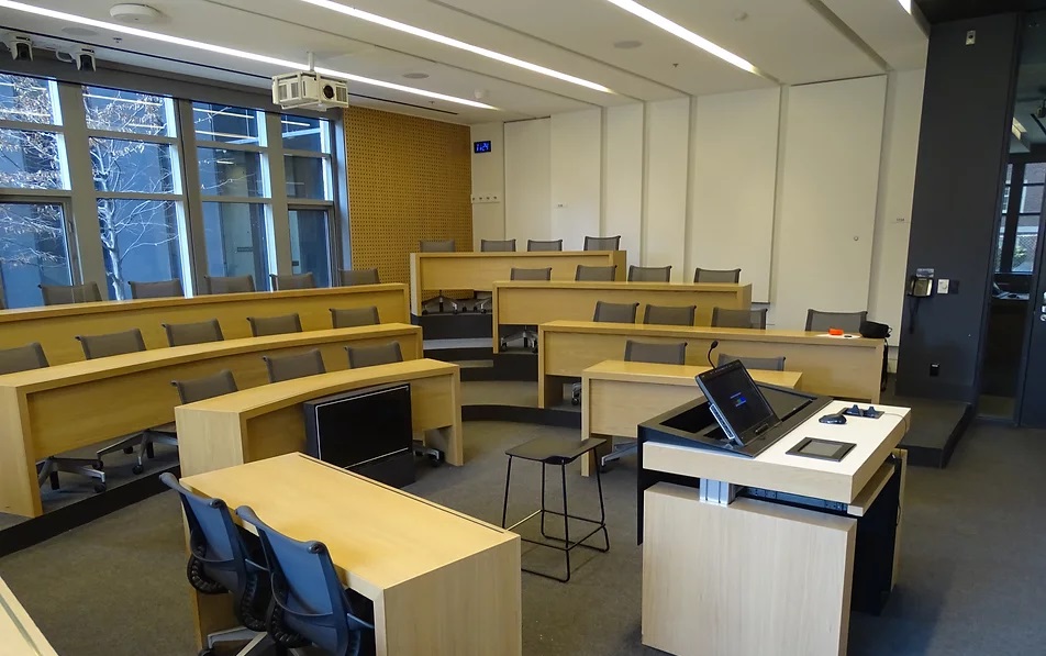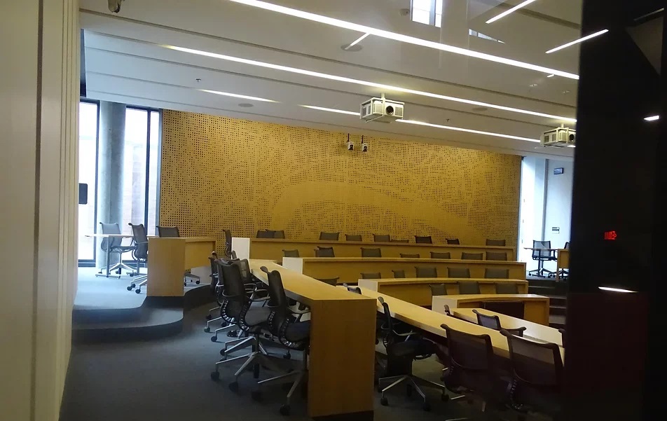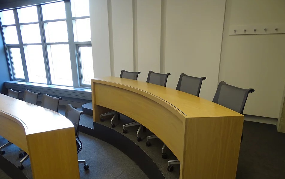 Wood cabinetry and solid surface countertops. Wood paneling and wood trims in lecture and lobby areas. Lecture hall desks.
