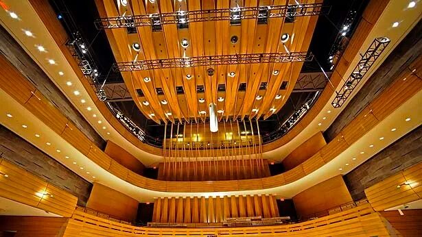Complex curved architectural beams suspended from the ceiling. Harwood trims, custom wood doors and frames, and balcony and stage paneling.
