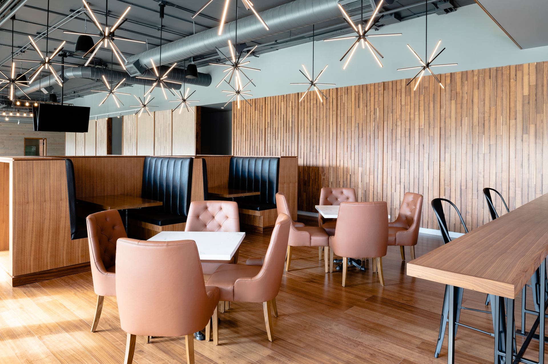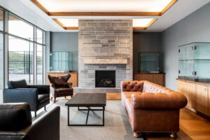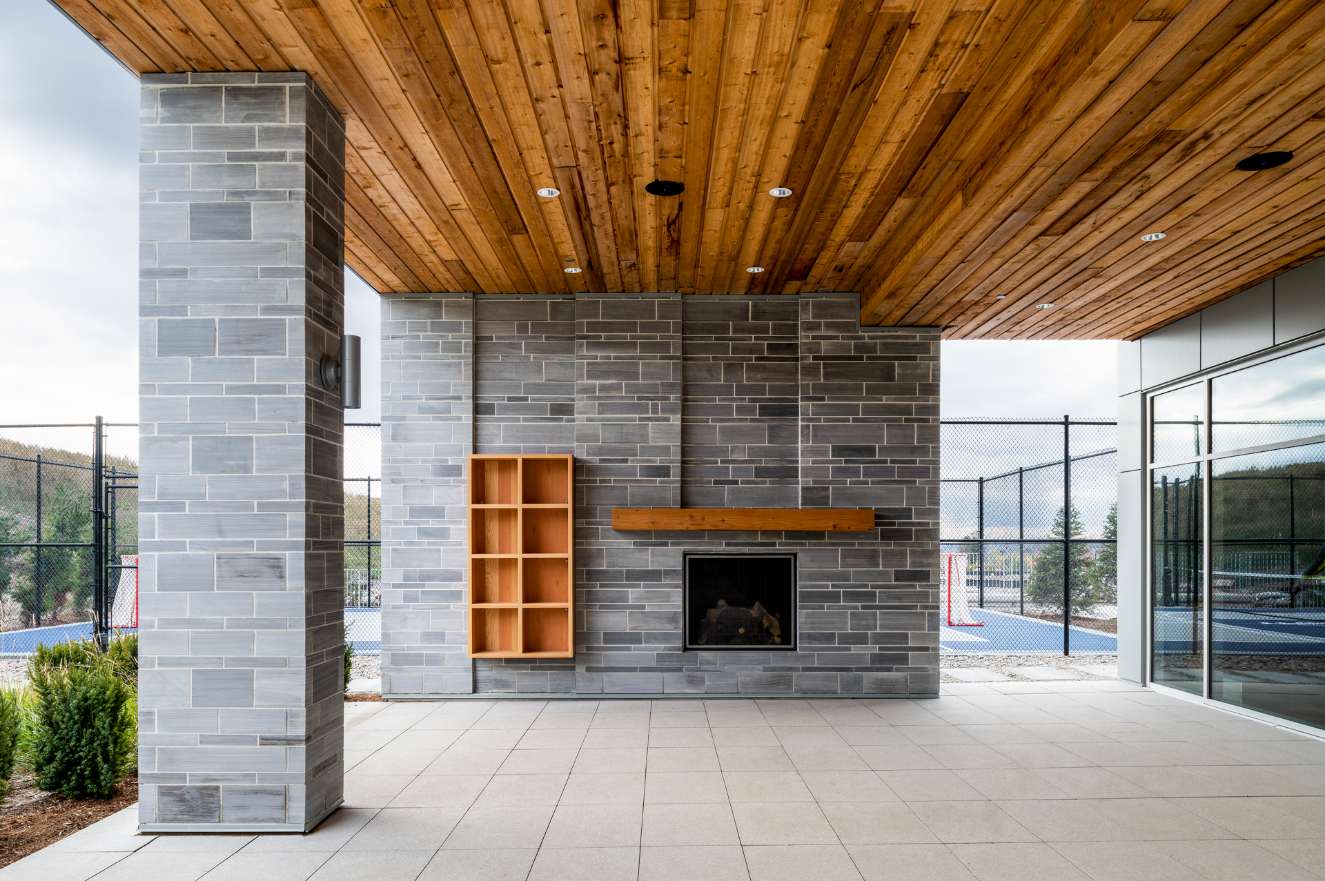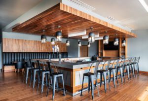 Custom bar and banquets, reception desk, trophy case, and outdoor patio with fireplace.